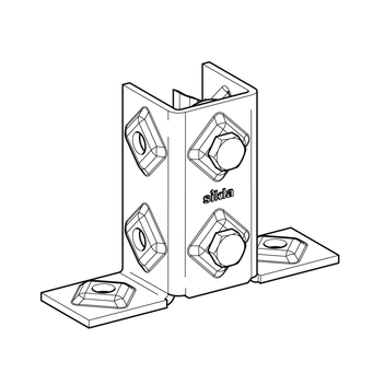 Elemento de conexión para la construcción de estructuras tridimensionales en carriles de montaje. Técnicas de fijación optimizadas para nudos de esquina en sistemas de carril 41. Conector angular tipo W para la conexión a pared, suelo o techo. Colocación y alineación flexible en la apertura del carril.