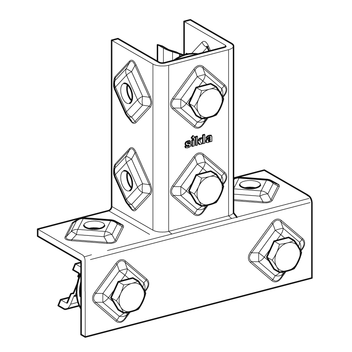 Elemento de conexión para la construcción de estructuras tridimensionales en carriles de montaje. Técnicas de fijación optimizadas para nudos de esquina en sistemas de carril 41. Colocación y alineación flexible en la apertura del carril.